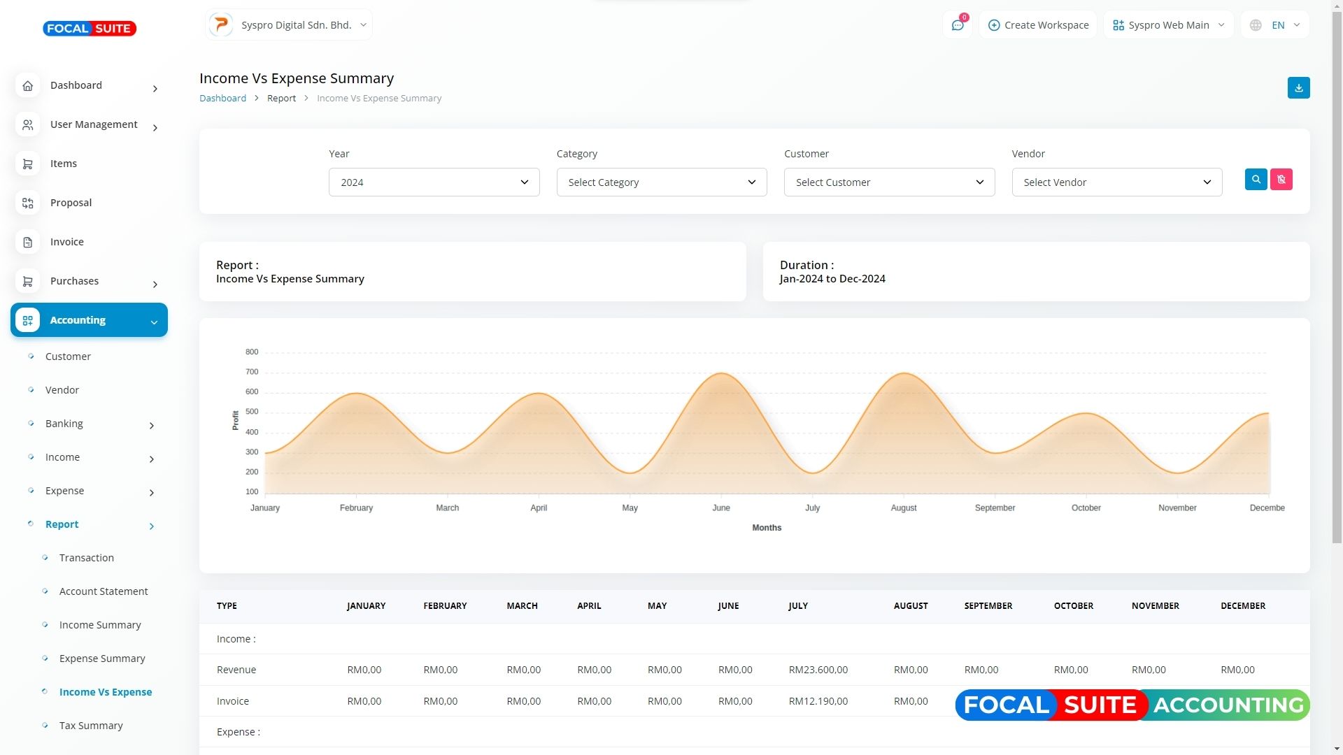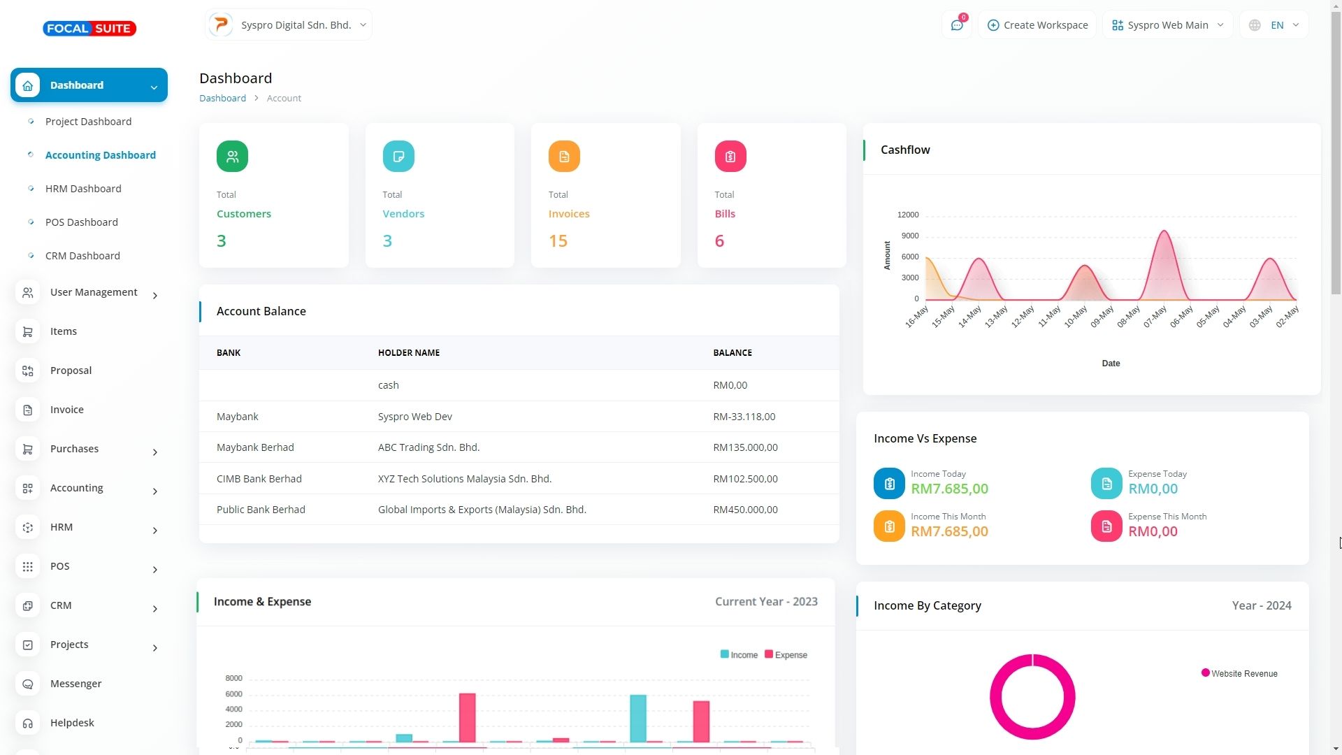 A budget is a financial plan designed to manage working capital over a set period. This feature assists in maintaining a steady flow of capital by allowing you to set budgets on a monthly, quarterly, semi-annual, or annual basis, tailored to your business objectives. You can manage and adjust budgets by category—such as "Income" and "Expense"—with options to edit, update, or delete sub-categories as needed.