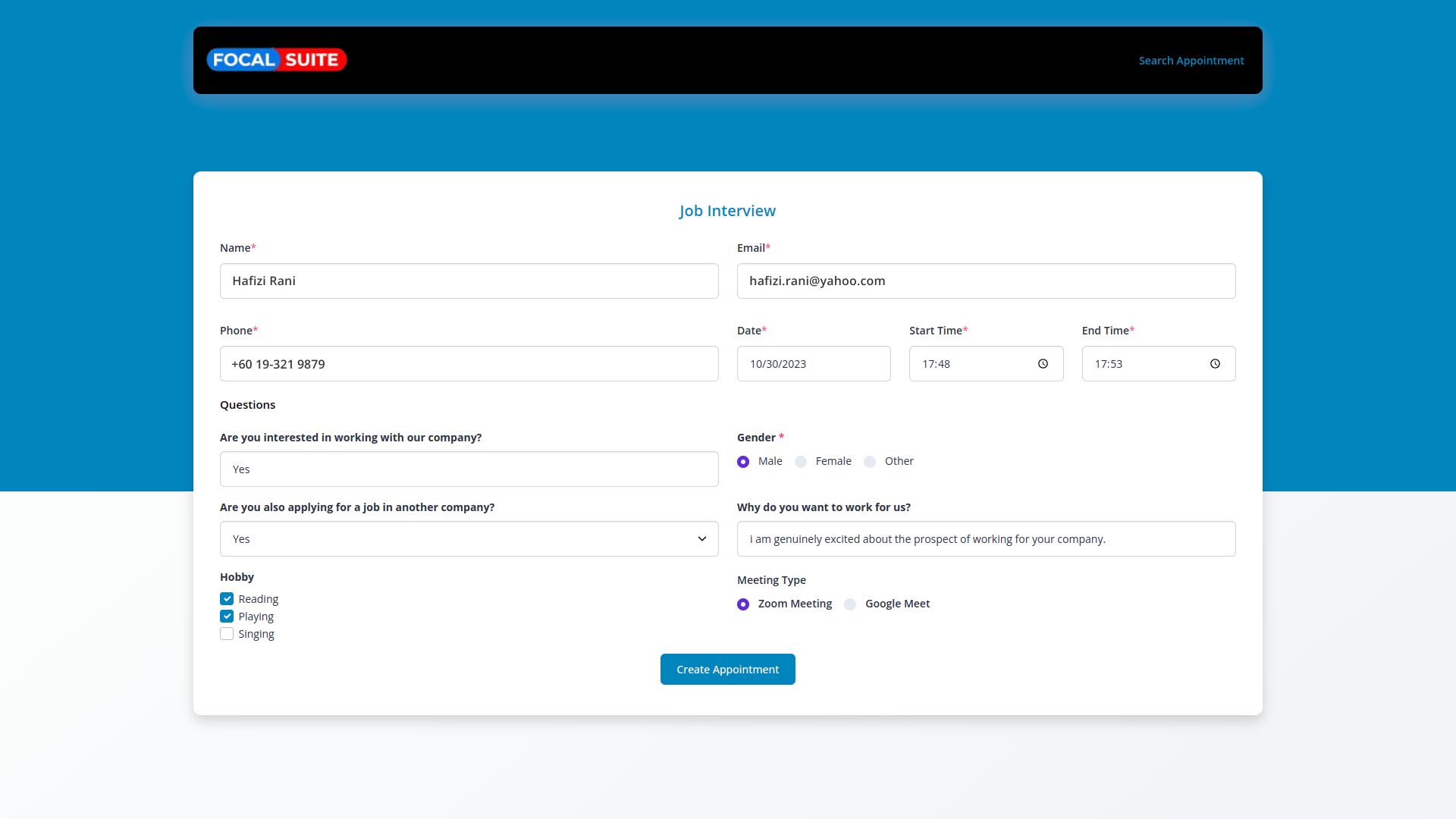In the appointment section, you can easily create appointments. It includes a calendar button that displays all scheduled appointments and changes color based on their status. Additionally, it features a copy link button, allowing users to share the appointment form for others to fill out effortlessly.